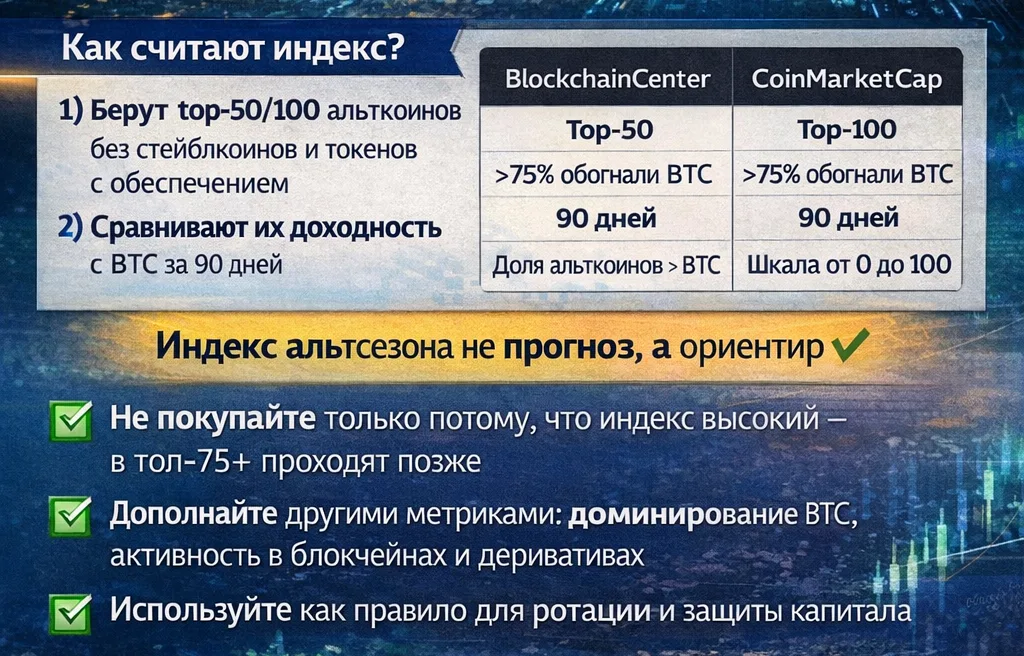 Микровывод: индекс альтсезона — это режимный индикатор; он лучше работает как “правило поведения” (risk-management), а не как кнопка “купить”.
